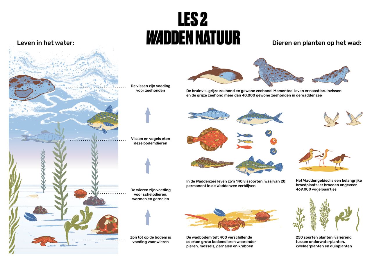 Als enige echte wildernis van Nederland heeft het waddengebied een enorme rijkdom aan verschillende soorten planten en dieren. Deze rijkdom aan leven is uitzonderlijk. Het gebied telt meer dan 10.000 verschillende soorten. Naast vaste bewoners, zijn er ook veel bezoekers. Ieder jaar maken 10 tot 12 miljoen trekvogels gebruik van het waddengebied. Het is het enige wadden- en kust-eilanden-systeem in de wereld met een gematigd klimaat van deze grootte en met zo'n enorme variatie. In deze les gaan we dieper in op de soorten die in dit gebied voorkomen. Daarnaast bekijken we de nationaal landschappen en andere natuurgebieden die het waddengebied rijk is.